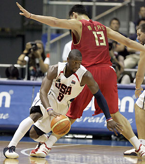 player Dwyane Wade (L) maneuvers around China's Yao Ming during the first