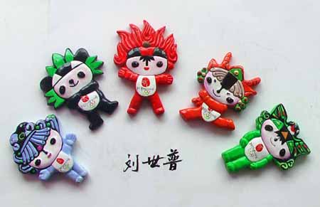 Clay figurines of the Five Friendlies, Mascots of the Beijing 2008 Olympic Games, made by mud craftsman Liu Shipu in Qingdao, east China's Shandong Province.