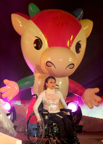 woman on a wheelchair moves past Fu Niu Lele, the official mascot of the