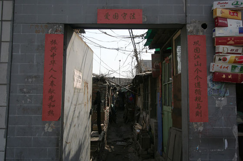 A typical house at a Hutong in Beijing.The couplets say people should love the country and obey the law.