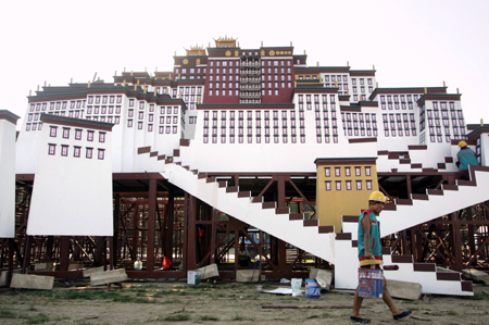 A worker walks in front of a replica of Tibet's Potala Palace in Tiananmen
