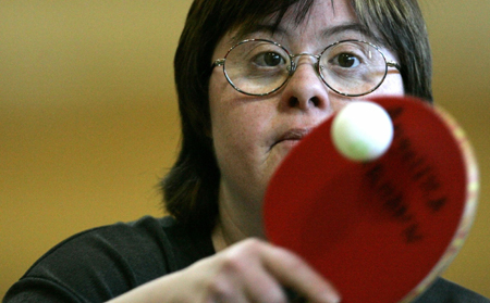 Angelika Haarmann returns the ball during the table tennis competition at the German national Special Olympics in Berlin, September 12, 2006. The Special Olympics is an international non-profit organization which is dedicated to empowering individuals with intellectual disabilities to become physically fit, productive and respected members of society through sports training and competition. [Reuters]