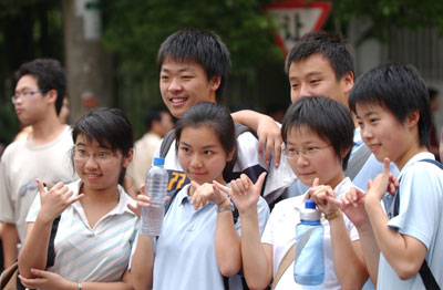 Exam-takers pose for a photo after they finish the two-day national college entrance exams, or Gaokao, outside a high school in Changhai, Central China's Hunan Province June 8, 2007. [Xinhua] ![]() ![]()