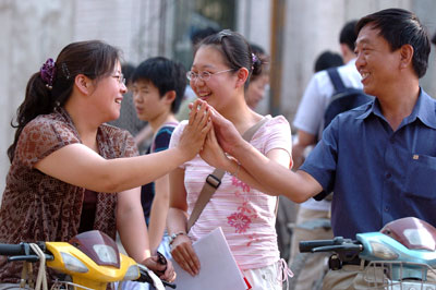 A girl clasps with her parents after after she finishes the two-day national college entrance exams, or Gaokao, outside a high school in Changhai, Central China's Hunan Province June 8, 2007. [Xinhua]