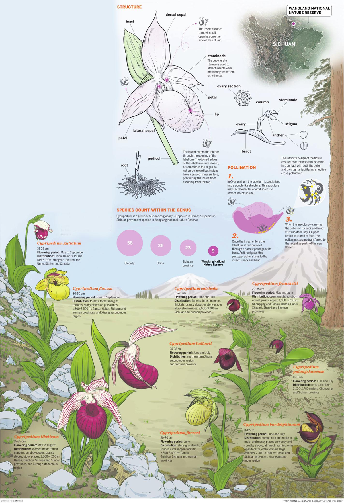 From 2020 to 2022, a comprehensive orchid survey was conducted in the reserve, with researchers completing investigations along 24 transects and 209 sample plots. Combining previous studies, Zhao said, the survey discovered that Wanglang is home to 45 species of orchids from 20 genera, including the nine Cypripedium species.