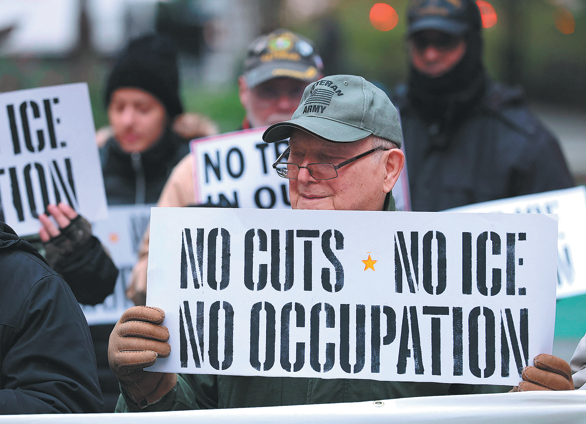 People protest on Veterans Day, a federal holiday in the United States observed annually on Nov 11, at City Hall Park on Tuesday in New York City, the US. The "Vets Say No Campaign" organized a nationwide day of protest to speak out against the US administration's deployment of the military for immigration actions alongside US Immigration and Customs Enforcement, along with concerns about cuts to federal funding and economic policies. MICHAEL M. SANTIAGO/AFP