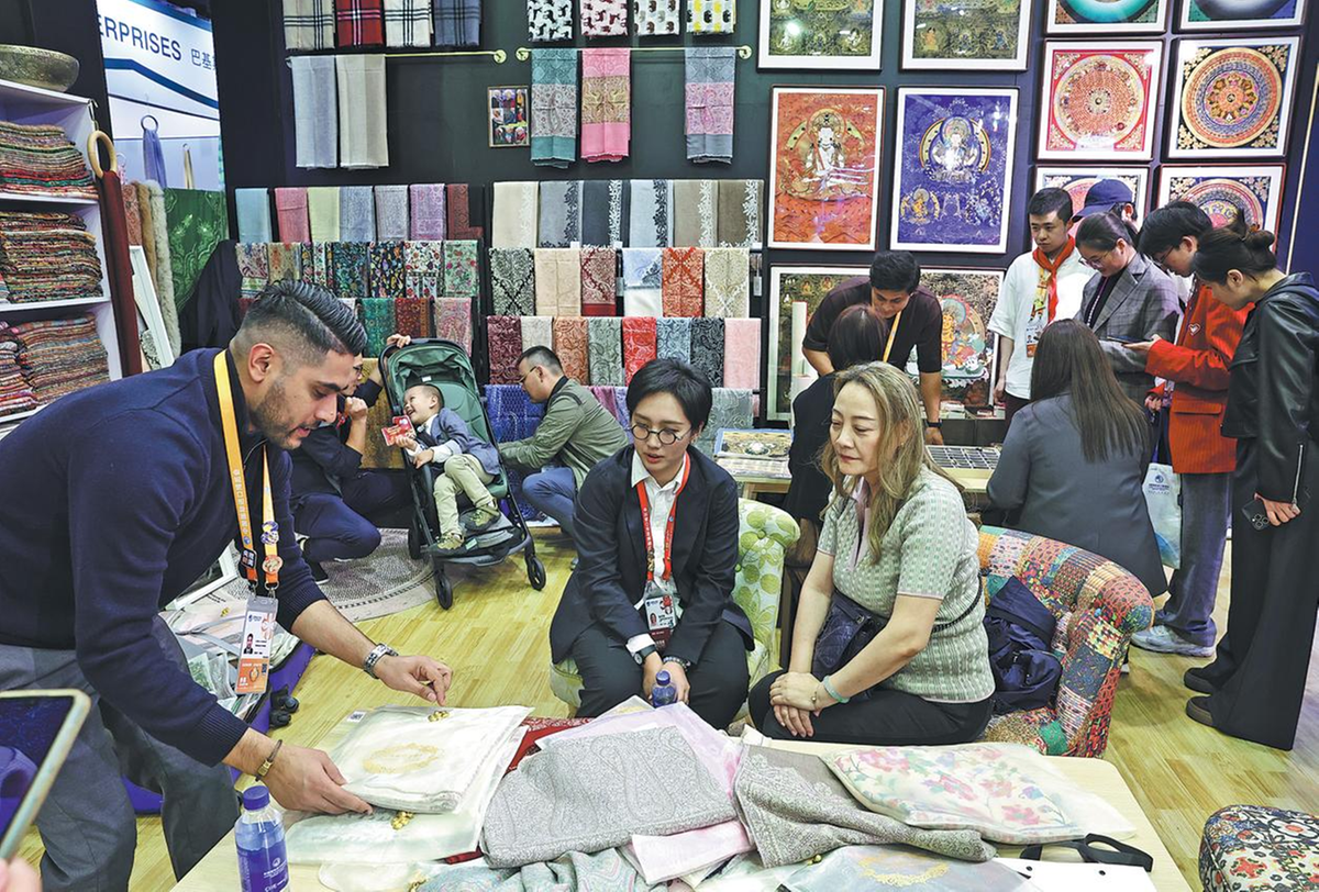 At a special pavilion celebrating the friendship between Lhasa, capital city of Xizang autonomous region, and Kathmandu of Nepal, Shrestha showcased his exquisite handmade family products related to religious ceremonies at the CIIE.