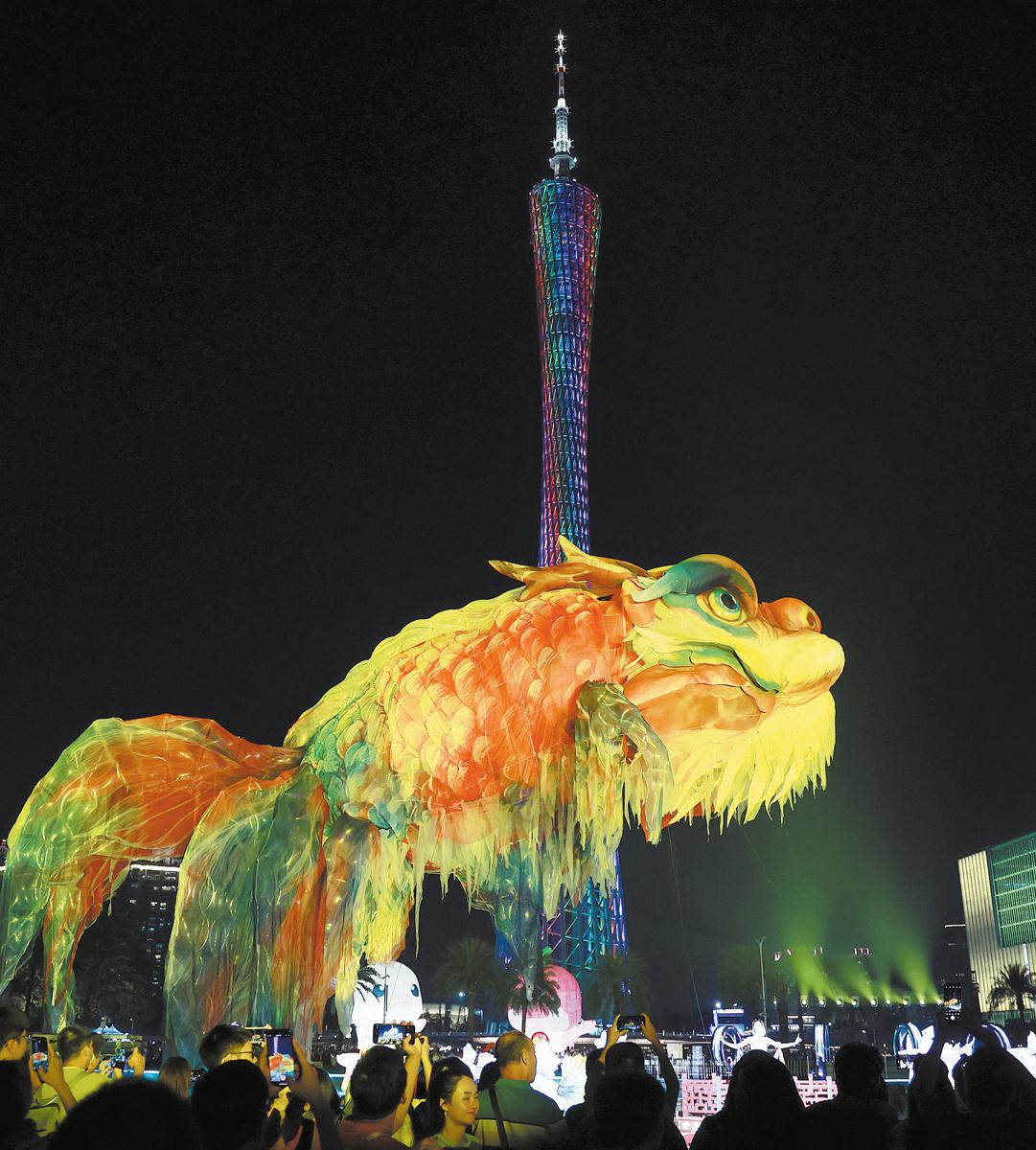 Visitors gather around a lantern of the giant Aoyu fish — a legendary mythical creature with the head of a dragon and the body of a fish — which gained fame at the opening ceremony of the 15th National Games, at the Guangzhou International Light Festival in Guangzhou, Guangdong province, on Nov 16, 2025. This year's festival will run till Nov 26. XIA SHIYAN/FOR CHINA DAILY