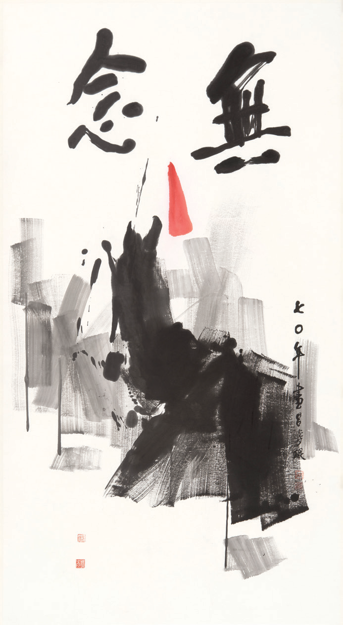 Lui's deep engagement with ancient Chinese philosophy is reflected in some of the paintings on display. The three-word title of Beyond All Thoughts (1970) references the Zen Buddhist practice of meditating while seated — fei si liang in Mandarin. The painting is an attempt to describe a state of consciousness that exists between thought and its absence while practicing Zenstyle meditation — a state in which one observes their own thoughts as if they were clouds passing through the sky, without trying to cling to them.