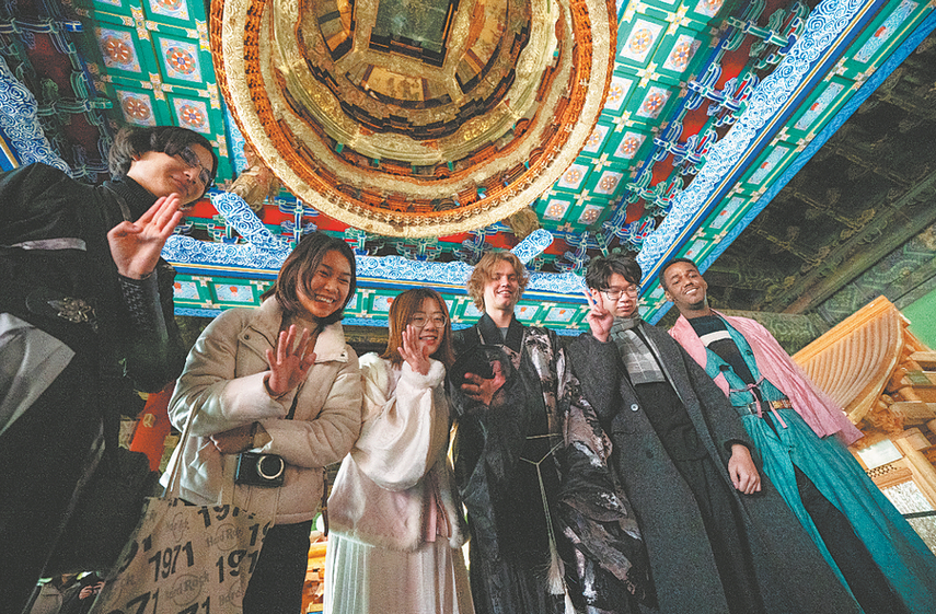 Guided by Tsinghua storytellers, 45 Chinese and international students visit Xiannongtan in Beijing on Nov 25 to appreciate traditional Chinese architecture. CHINA DAILY