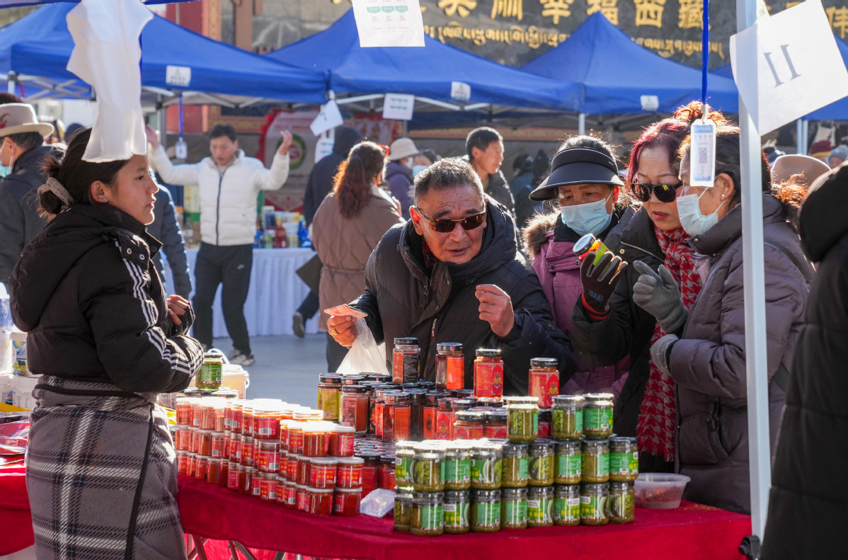 People select products during a supply and marketing fair at a park in Lhasa, Southwest China's Xizang autonomous region, Dec 10, 2025. The event has gathered more than 1,000 characteristic agricultural products from Xizang, including highland barley products, yak meat products, dairy products and so on, providing a platform for farmers and herdsmen to increase their income and people to purchase authentic specialties. [Photo/Xinhua]