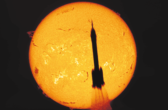 The Long March 2F Y22 rocket carrying the Shenzhou XXII is silhouetted with the sun behind on Nov 25. OPTIC MEASUREMENT TEAM OF THE JIUQUAN SATELLITE LAUNCH CENTER/FOR CHINA DAILY