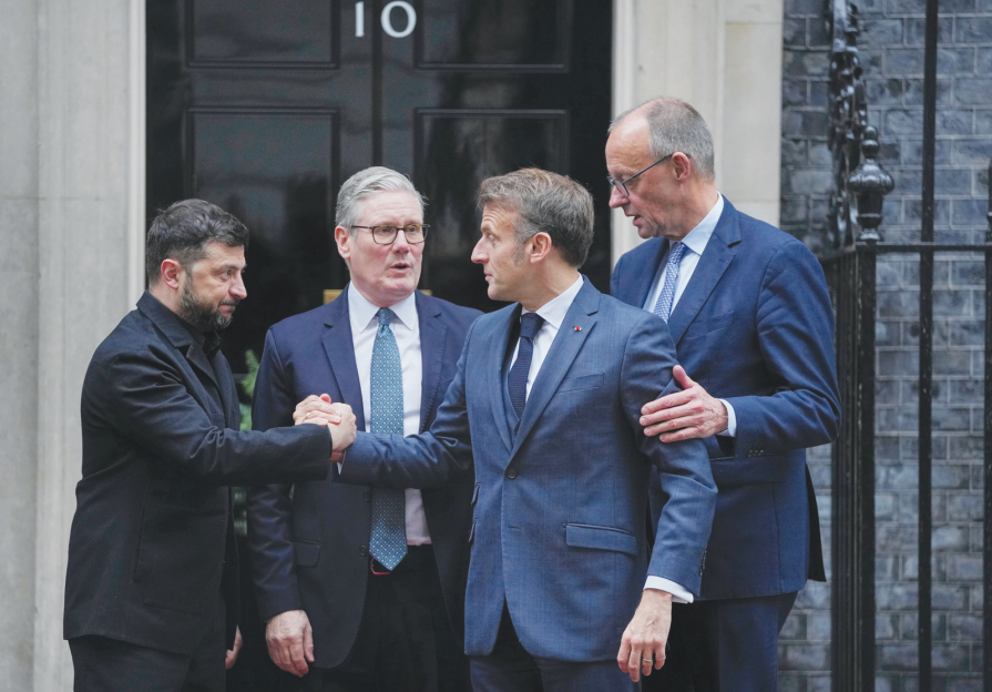 Ukraine's President Volodymyr Zelensky (left), interacts with France's President Emmanuel Macron (second from right), Germany's Chancellor Friedrich Merz (right) and United Kingdom Prime Minister Keir Starmer at 10 Downing Street, London on Monday, after a meeting about a possible peace plan for the Russia-Ukraine conflict. KIN CHEUNG/AP