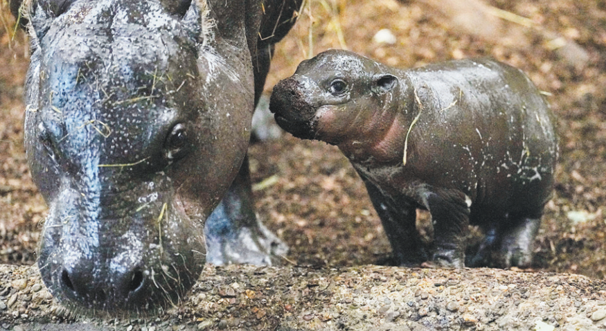 Panya, a two-week-old pygmy hippopotamus, walks with its mother into their enclosure at the zoo in Duisburg, Germany for the first time on Monday. MARTIN MEISSNER/AP