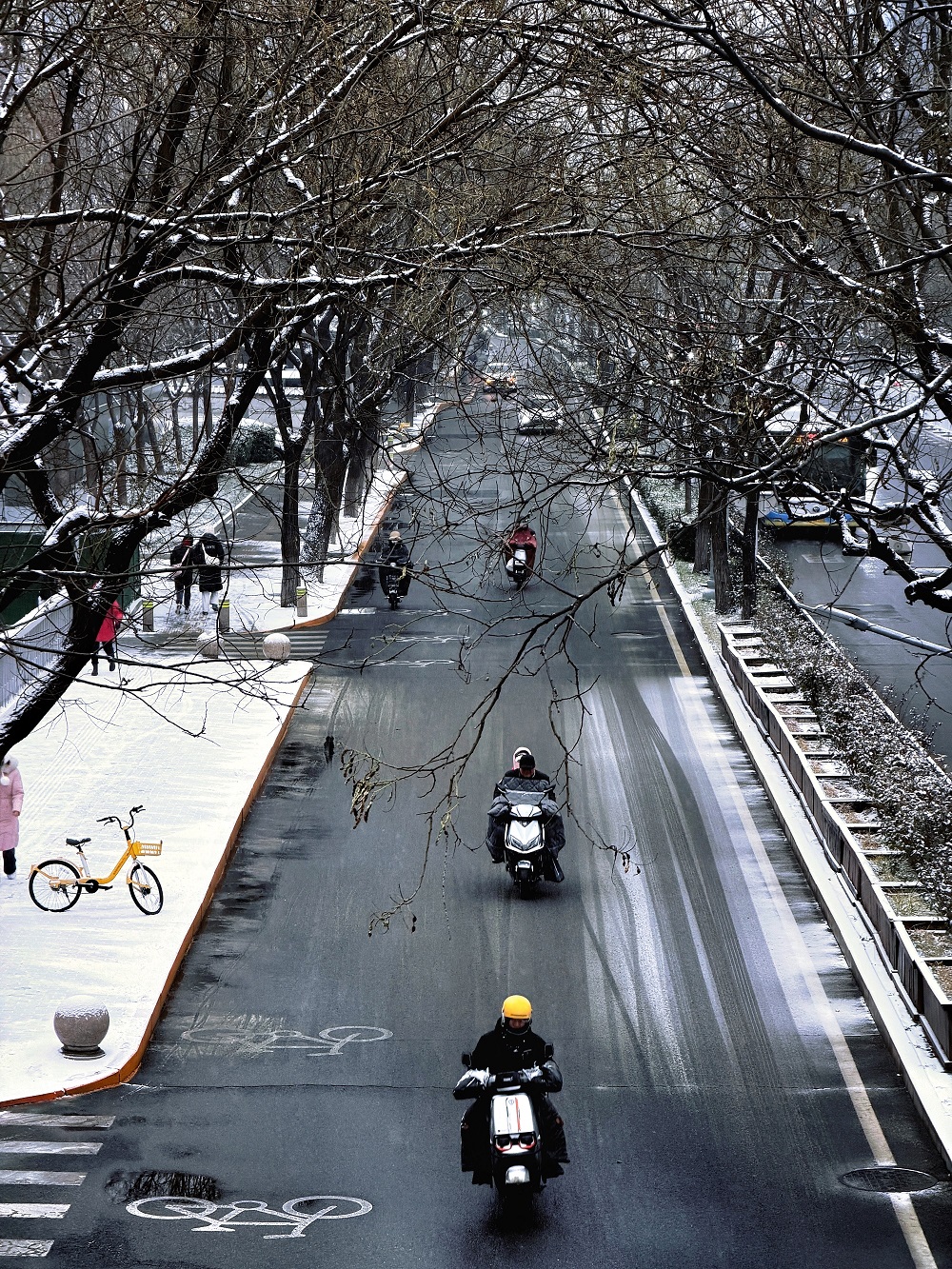 People brave the cold and snow in Xicheng district, Beijing, Dec 12, 2025. [Photo by Du Lianyi/chinadaily.com.cn]