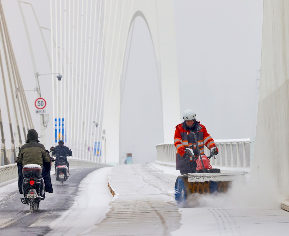 Staffs clear snow at the New Shougang Bridge in Beijing, Dec 12, 2025. [Photo by Zhang Yunlong/for chinadaily.com.cn]
