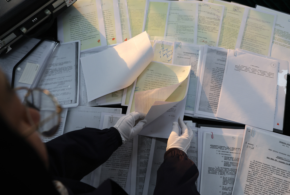A staff member of the National Archives Administration of China sorts a set of declassified archives detailing the Soviet Union's interrogations of Unit 731, the notorious biological warfare force of the Japanese Imperial Army during World War II on Dec 10, 2025. [Photo by Zou Hong/chinadaily.com.cn]