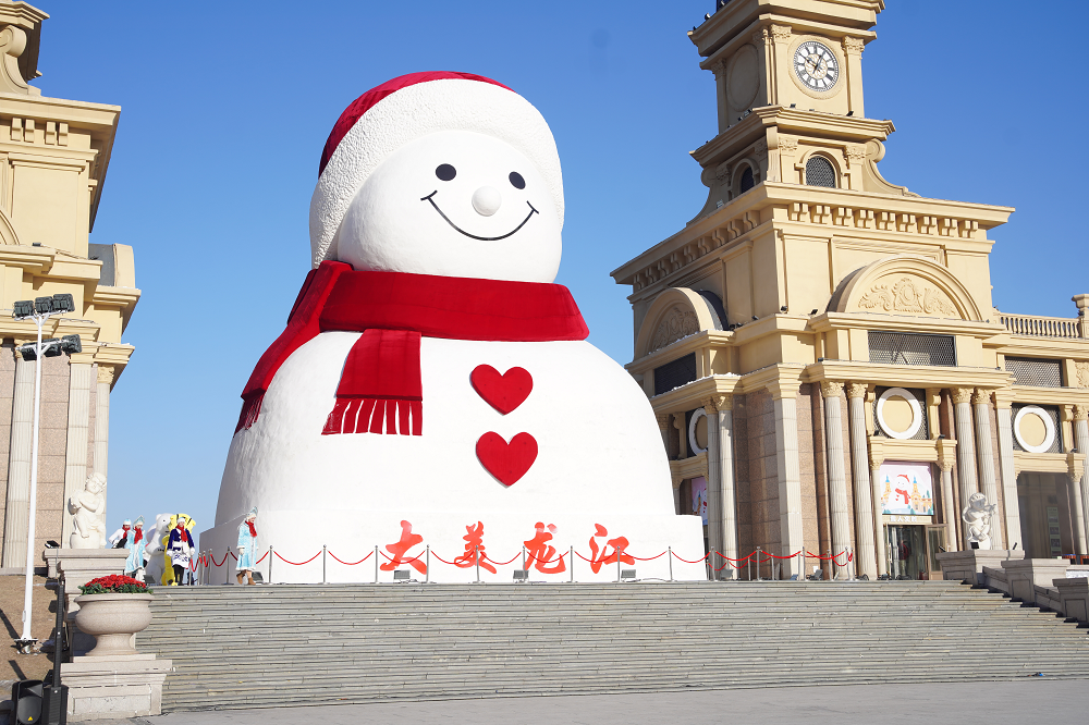 On Tuesday, a 19-meter-tall snowman was completed on the bank of the Songhua River, becoming an opportunity for wintery photos in Harbin, the capital of Northeast China's Heilongjiang province. [Photo provided to chinadaily.com.cn]