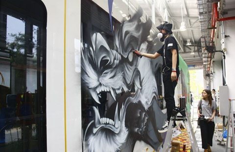 Chinese and foreign graffiti artists decorate trolley in Guangzhou