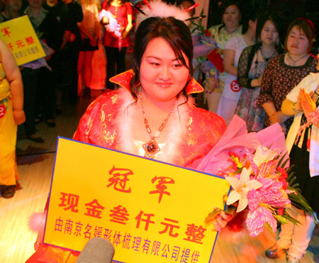 Wang Pu who is 1.64 meters talls and weighs 93 kilograms wins the beauty contest for overweight people in Nanjing, East China's Jiangsu Province, April 2, 2006. [newsphoto]