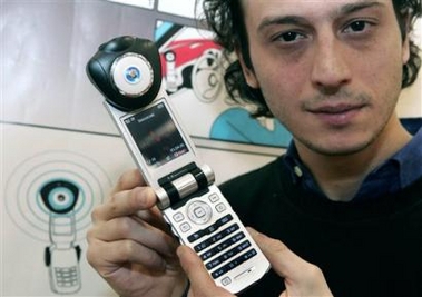 Michael Attali from France presents his invention, 'bbphone', a hands-free