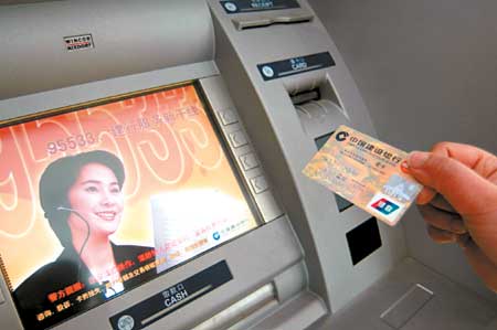 withdraws money at an ATM machine at a China Construction Bank outlet in