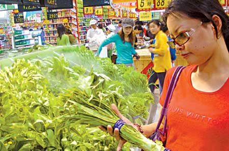 A woman selects fresh vegetables at a department store near Donghuan Road in Suzhou, East China's Jiangsu Province. [newsphoto]