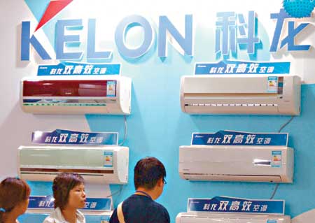 Visitors look at Kelon air-conditioners at a recent electronics fair in Shanghai. Kelon, once the biggest home appliance manufacturer in China, reported that its net loss last year grew to 3.7 billion yuan from 246 million yuan a year earlier. [newsphoto]