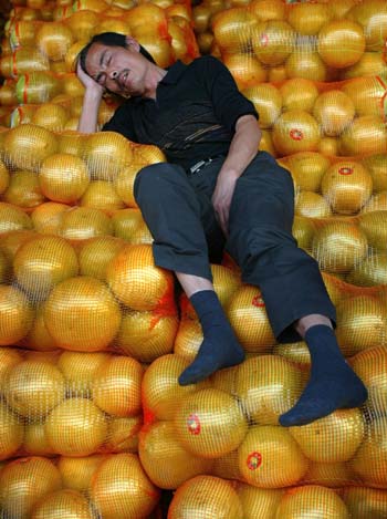 A vendor sleeps on sacks of grapefruits at a wholesale market in Nanjing,