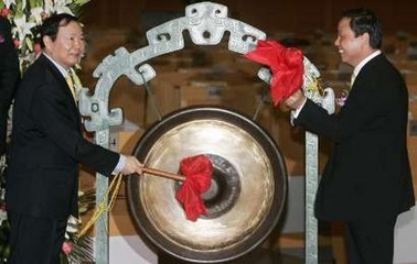 China Life Insurance Co Chairman Yang Chao (L) and President Wu Yan strike a 'gong' at Lujiazui Financial Area in Shanghai January 9, 2007. Shares in China Life Insurance Co, the country's biggest life insurer, more than doubled in their Shanghai debut on Tuesday, attracting huge interest as the first insurer to list on the country's domestic stock market. [Reuters]