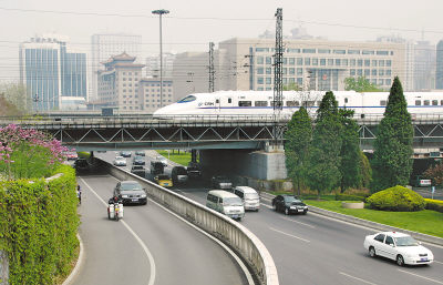 The No D533 train, a Beijing-Tianjin intercity high-speed train, runs through Beijing's urban area, April 18, 2007. [Xinhua]