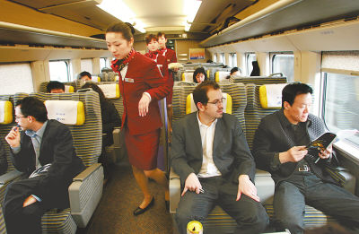 Attendants serve passengers with food and drinks on the No D533 train, a Beijing-Tianjin intercity high-speed train, April 18, 2007. [Xinhua]