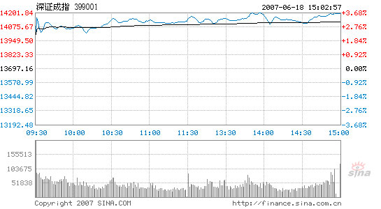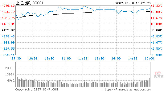 Stocks regain 4,200-point battleground, 06/18By Li Zengxin (chinadaily.com.cn)Updated: 2007-06-18 15:35 Chinese stocks regained the 4,200-point battlefield today, in absence of tightening measures over the weekend. The Shanghai Composite Index closed at 4,253.35, up 120.48 points or 2.92 percent from Friday's closing. Total turnover in the stocks enclosed by the major indices was 277.6 billion yuan, still low but higher than that of last Friday. The index, opening higher from 4,195.39, climbed higher in the morning and fell a little during the afternoon session, on a steady upward trend. It finished the day within a range from 4,193.31 to 4267.74, both higher than the previous closing. Shanghai Composite