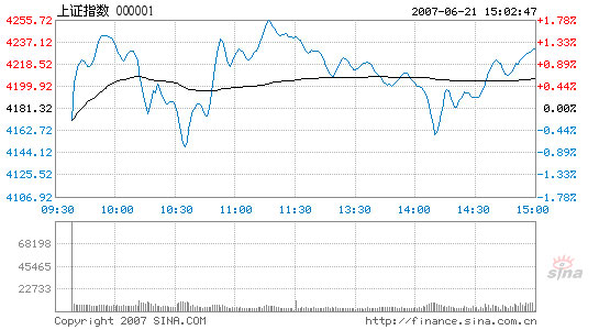 Stocks up with lowest turnover this week, 06/21By Li Zengxin (chinadaily.com.cn)Updated: 2007-06-21 15:52 Chinese stocks fluctuated violently today but managed to return to a higher level. The Shanghai Composite Index closed at 4,230.82, up 49.5 points or 1.18 percent from yesterday's closing. Total turnover of the stocks enclosed by the major indices was 247.6 billion yuan, the lowest this week. Opening lower from 4,170.89, the benchmark index rose sharply to the first peak after it started, but soon dived to the lowest 4,147.05. Then it hiked in waves to the second but higher peak at 4,256.54. But from there it plunged again, hit the bottom around the mid-point of the afternoon session, and then edged up to the close. Shanghai Composite