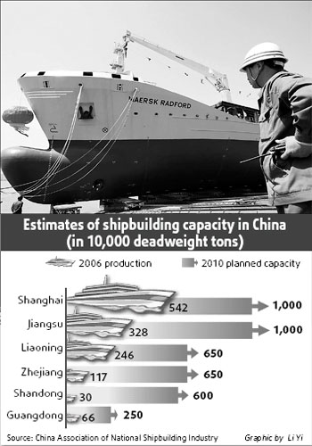 sector's main watchdog. You said the expected excess capacity has mainly resulted from profligate investment by domestic private and foreign companies to cash in on new vessel demand. Many projects funded by these investors don't comply with China's regulations for the shipbuilding sector, she added. According to the rules, total input in a new shipbuilding project should reach at least 2 billion yuan, of which no less than 40 percent should come from investors themselves. The Chinese side should hold a stake of at least 51 percent in their shipbuilding joint ventures with foreign partners. Sino-foreign ventures are required to build their own technical centers. Projects for low-and-medium-speed diesel engines for vessels are not permitted in China. "We will implement the existing regulations more strictly and work out new measures to put the sector in order," You told China Daily. She also warned of investment risks in the sector, although the global ship market has been flourishing since 2003. "Demand for new vessels are likely to fluctuate widely in coming years. Therefore, investors should keep vigilant about possible risks," she stressed. "Shipyards in China will suffer a lot from global market fluctuations if overcapacity cannot be prevented as they rely heavily on orders from foreign buyers."