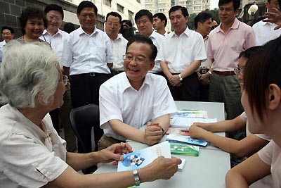 Chinese Premier Wen Jiabao on early Saturday morning visits a community medical service center to see how the basic medicare for urban residents works. [Xinhua]
