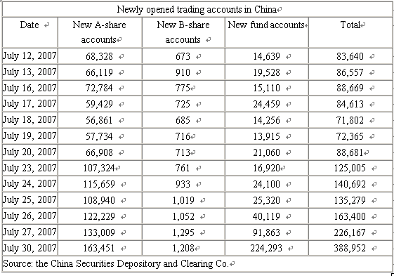 Stimulated by the bull run, the number of newly opened trading accounts in China has gradually increased. Investors opened 388,952 accounts at brokerages on Monday, including 163,451 A-share accounts, 1,208 B-share accounts and 224,293 fund accounts. It is the first time in the past two months that the number of new fund accounts has exceeded that of A-share accounts, according to figures from the China Securities Depository and Clearing Co. On July 30, the number of trading accounts in China reached a total of 109.63 million, including 93.68 million A-share accounts, 2.24 million B-share accounts and 13.71 million fund accounts, the clearing house's data shows.