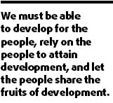 Hu said: "Our Party's fundamental goal is to serve the people wholeheartedly. All our Party's endeavors and work are to benefit the people. We must always fully realize, safeguard and develop the fundamental interests of the broad masses of the people, regarding it as a starting point and the purpose of all of the work of the Party and country. We must be able to develop for the people, rely on the people to attain development, and let the people share the fruits of development."