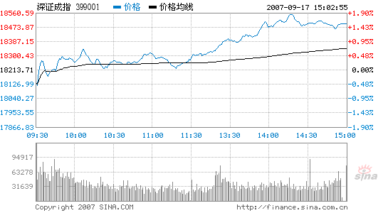 The Shenzhen Component Index, tracking the smaller Shenzhen Stock Exchange, finished at 18,494.38, also a record-high close and 280.67 points or 1.54 percent up than last Friday. Opening lower at 18,131.08, it went through the day within a range of between 18,092.15 and 18,553.89.