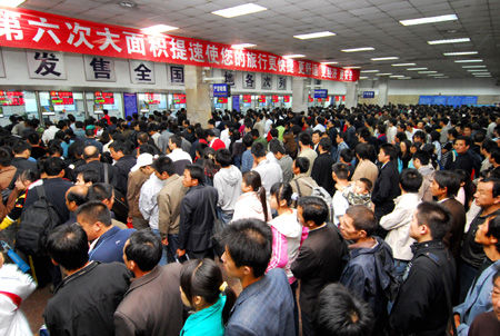 Updated: 2007-10-01 14:44 ![]() People line up for train tickets at the Xi'an Railway Station, Northwest China's Shaanxi Province. China's National Day, which falls on October 1, was first officially prolonged to a week-long holiday in 1999. Many people choose to travel across the country during the seven-day National Day holiday. The capital's tourism administration bureau has predicted that about 1.7 million people will visit the capital during the seven-day holiday. [newsphoto]
