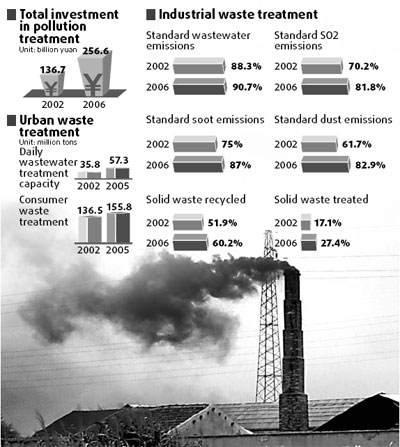 Investment in environmental protection in 2006 accounted for 1.22 percent of the country's gross domestic product (GDP), compared with 1.14 percent in 2002, said the NBS. China's environmental protection industry has seen rapid growth in the past five years, according to the NBS. In 2006, the total turnover of the sector was 600 billion yuan while profits amounted to 52 billion yuan. The country has also seen a sound legal system for environmental protection since the 16th National Congress of the Communist Party of China convened in 2002. Over 50 regulations on environmental protection have been put in place since. Energy saving and environmental protection have become a key policy for the country. The government aims to reduce energy consumption per unit of GDP by 20 percent and major pollutant discharges by 10 percent in the 11th Five-Year Plan period (2006-10). Take the nation's power industry for example. China will close down all its coal-fired power plants, with a combined capacity of 50,000 mW, by 2010. Desulfurizing facilities with a capacity of 104 million kW were put into operation at the nation's power plants last year. Now power-generating units with desulfurizing facilities account for around 30 percent of the country's total power plants, compared with 12 percent in 2005. Along with the nation's ongoing efforts to check pollution, China's forest coverage has risen constantly for almost two decades, increasing the nation's contribution to the world carbon dioxide absorption. Chinese land vulnerable to desertification is dwindling by about 1,283 sq km per year thanks to years of afforestation, said the NBS.