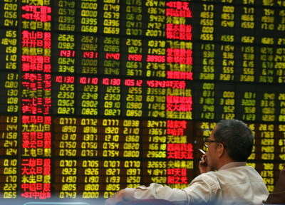 A man sits in front of an electronic board at a stock exchange in Tianjin municipality, October 12, 2007. [Agencies]