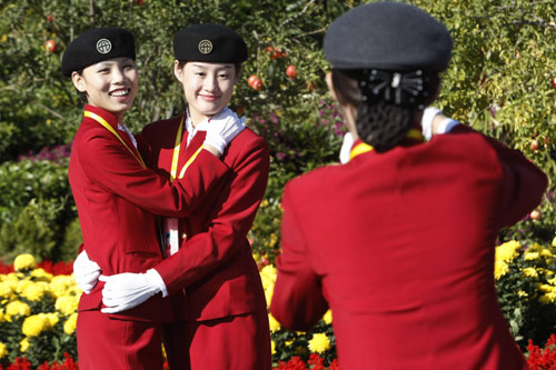 Hostesses for China's Communist Party 17th Congress pose for a photo at the Tiananmen Square during a preparatory meeting in Beijing, October 14, 2007. China's Communist Party opens its 17th Congress on October 15. [Reuters]