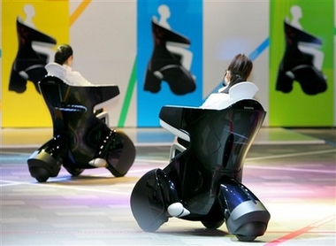 Models steer Toyota Motor Corp.'s concept car "i-Real" during an event prior to Tokyo Motor Show in Tokyo Wednesday, Oct. 10, 2007. The single-seat vehicle looks like a roofless plush armchair that scoots about on wheels, with buttons and controls on the arms. It changes positions, straightening up for moving slowly to mingle with pedestrians, while shifting to lay back to travel faster at up to 30 kph (18.6 mph). [Agencies]