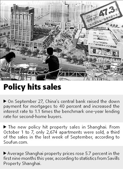 Average Shanghai property prices have risen 5.7 percent in the first nine months this year, according to statistics from Savills Property Shanghai. Wang Yuqi originally planned to buy an apartment in the business center of Jing'an District using earnings from the stock market. The average price in the area is 40,000 yuan persqm. But the new policy has forced him to abandon his plan. Market insiders said many real estate investors will be hit by the new policy on second homes. The government raised mortgage deposits from 30 percent to 40 percent and increased the interest rate to 1.1 times the benchmark lending rate for second-home buyers. That's an interest rate of 8.6 percent for a 10-year mortgage. Second-home buyers will have to pay an extra 100,000 yuan for a mortgage deposit and 62,274 yuan more for a 15-year loan on a 1-million-yuan apartment. "Buyers are struggling to get big enough loans because banks are taking a conservative approach to property appraisals. In many cases properties are valued at less than the sale price," said Gao Shugui, a sales manager at Centaline China Property. The slump in demand is prompting owners to lower prices. According to statistics from Midland Holdings, around 80 percent of owners had lowered prices in Shanghai as at October 10. Of the price drops, 75 percent were reduced to within 5 percent, 3 percent were cut by 6 to 10 percent and 2 percent fell by 10 percent. "Some real estate investors are selling their holdings because they're worried the government will launch further tightening policies," said Feng Hongrui, general manager of Midland Holdings in Shanghai. Tightened lending is expected to push small and medium-sized developers to speed up the sale of new apartments to recycle their working capital. "Smaller developers that lack working capital and find it difficult to access the capital market for funding will likely be hit hard. They might be forced to sell off incomplete projects," said Hingyin Lee, director of research and consultancy at Colliers International Property Consultants (Shanghai) Co Ltd. Gao said the market will stay calm until details of the new property policy are released. But many analysts said the measure will have little adverse impact on genuine buyers in the long term because many are already paying deposits of more than 30 percent of the property price. Recently, 80 percent of residential buyers have had to pay mortgage deposits of 40 percent or more. "The details of the new policy have not been released, so we could see banks interpreting it in different ways," said Shao Minghao, an analyst at Hanyu Property. The Shanghai government has taken several measures to prevent developers from withholding apartments to manipulate property prices, which have boosted supply. Projects of less than 30,000sqm in gross floor area must now be pre-sold in one go. For developments of more than 30,000sqm, developers will be allowed to pre-sell or sell in phases on the condition that each phase offers at least 30,000sqm in gross floor area, according to the Shanghai municipal housing, land and resource administration bureau. |