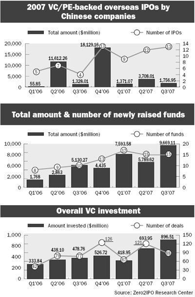 Updated: 2007-10-29 11:59 Investors maintained their enthusiasm for Chinese companies in the past quarter as an array of new funds were raised and the latest public listings generated abundant returns to investors, recent reports show. Private equity Private equity firms raised a total of US$9.67 billion for 15 Asia-focused funds in the third quarter, up 88.5 percent over the same period a year ago, according a report by Zero2IPO, a Beijing-based researcher focusing on the nation's venture capital and private equity sectors. Of the newly established funds, buyout funds raised US$5.27 billion, more than half of the total. The capital available is expected to give a boost to the Chinese buyout market, which has registered only modest growth over the past year. Forty-three Chinese enterprises attracted US$3.47 billion from 38 private equity investors in the third quarter, a year-on-year growth of 36.3 percent . Traditional industries were the clear favorites for private equity investors, with more than half of the investment in the third quarter going to those companies in the sector. United States-based private equity firm Blackstone was among those that looked to traditional industry when it spent US$600 million this September to acquire 20 percent of China National BlueStar (Group) Corp, a major chemical maker in the nation. Private equity firms now have strong interests in traditional industries such as manufacturing, real estate and chemical manufacturing. In the second quarter, 18 traditional enterprises secured US$2.64 billion in investment from venture capitalists, or 76.3 percent of the total. The nation's fledgling service sector is another focus of investment as 12 enterprises from services industries landed US$417.8 million, or 12.1 of the total amounted invested. Venture capital During the same period, 13 venture capital firms raised US$1.32 billion to invest in China. Among them, domestic companies established eight funds with a total of US$330 million as local enterprises and wealthy businesspeople prepare to enter the venture capital business.