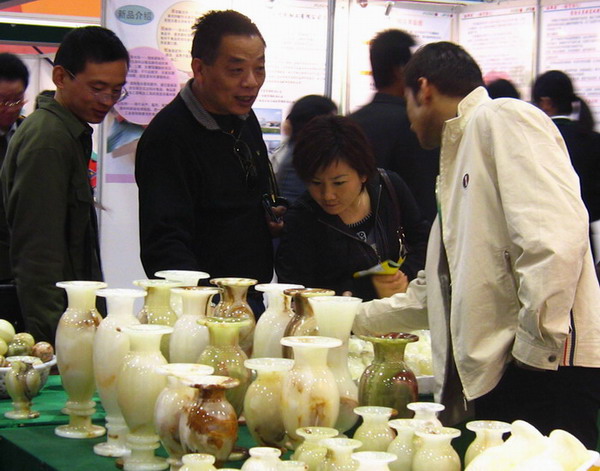 Visitors inspect jade products at the Asia-Europe Meeting (ASEM) Trade and Investment Fair on Small and Medium-sized Enterprises, which opened yesterday in Qingdao, Shandong Province. More than 600 enterprises and over 200 buyers from ASEM members are attending the event. [China Daily]