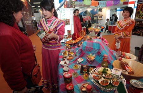 Flavourings and cates from Mexico attract a Chinese housewife at the Expo. The Latin American and Central and Eastern countries are eager to cash in on the promising Chinese market.[newsphoto]