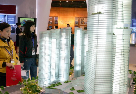 Visitors look at a house model at the 9th China International Real Estate & Archi-tech Fair which opened Tuesday in Beijing. Nearly 100 property firms attend the three-day fair. [Xinhua]