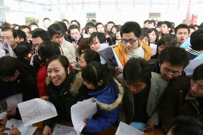 College graduates flock to a job fair in Kaifeng, Henan Province in search of the right opening in December 2007. More than 300 companies offered almost 6,000 jobs at the fair. [China Daily]